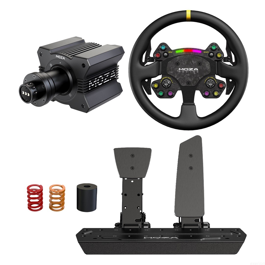 MOZA Racing R9 Direct Drive, RS Steering Wheel, SRP Pedals Set to kompletny zestaw do rozpoczęcia profesjonalnej przygody z sim racing’iem czyli wejścia w świat kierownic z wyższej półki. Zestaw składa się z bazy kierownicy z napędem bezpośrednim, z koła kierownicy o średnicy 33 cm i zestawu dwóch pedałów i zestawu upgrade do nich.