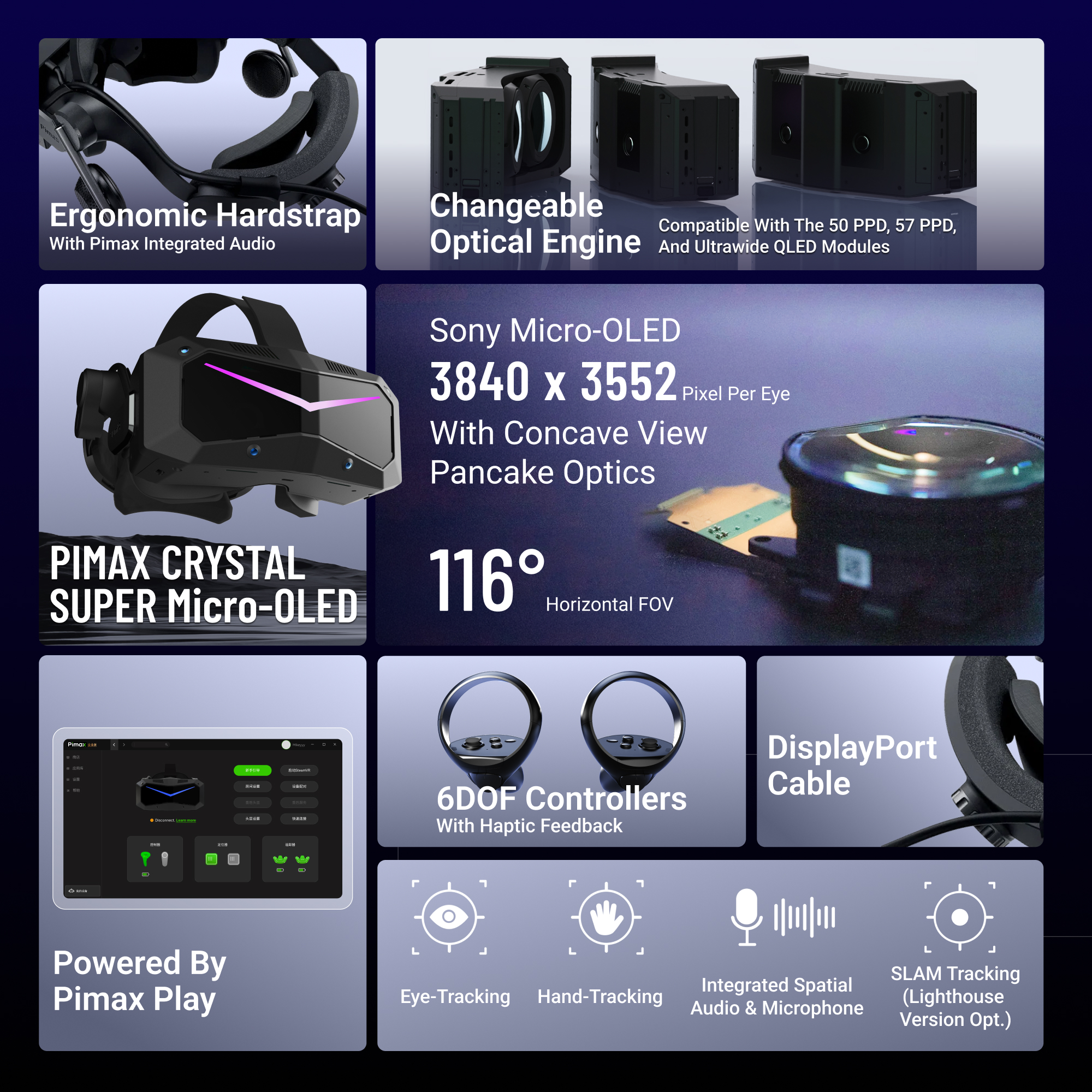 PIMAX Crystal Super 8K Micro OLED zapewnia niezrównaną klarowność obrazu, komfort użytkowania i modułową rozbudowę, na nowo definiując granice możliwości wirtualnej rzeczywistości. Dzięki krystalicznie czystemu obrazowi w rozdzielczości 8K i zaawansowanej technologii wyświetlaczy Micro OLED każda chwila wydaje się bardziej realistyczna niż kiedykolwiek wcześniej.